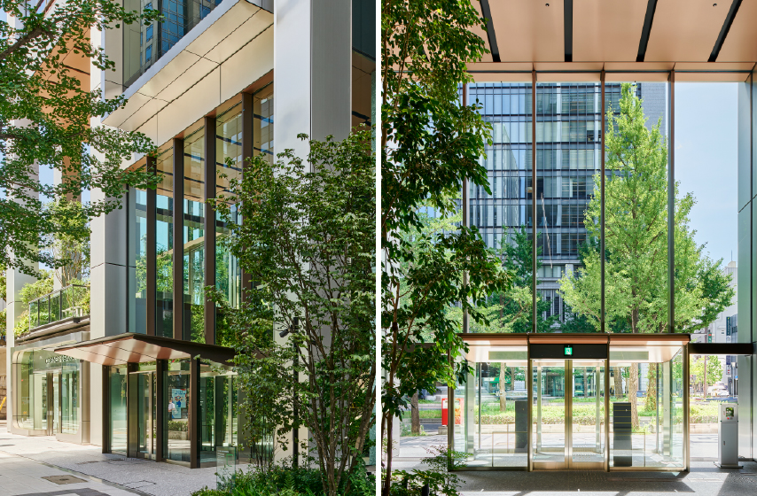 カーテンウォール・自動片引框扉:ステンレス ヘアーライン仕上・フッ素樹脂焼付塗装仕上
