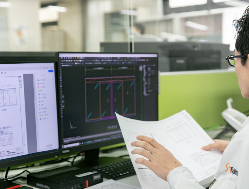 建築図面をもとに建具をはじめ様々な建築用金属製品の図面を作成します。施工会社をはじめ社内外と調整しながら、製作から施工までを見据えた設計業務を行っています。基本的に、ひとつの案件はひとりで担当します。他の部署同様に女性社員も活躍している部署です。